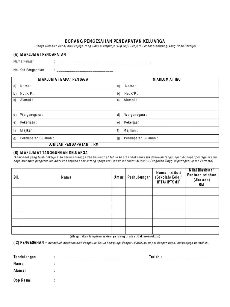 Pengesahan dari ketua kampung / ketua penduduk / pesuruhjaya sumpah. Untuk pengetahuan semua, surat pengesahan pendapatan ialah merupakan sebuah surat rasmi yang mengesahkan individu yang tidak mempunyai gaji .